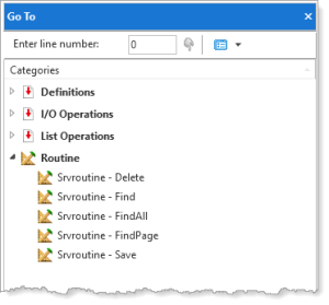 1. Switch to your Departments Server Module in the editor. Select the Go To tab. If this is not already open, use the Tabs menu on the Home ribbon to open it. This lists its srvroutines under Routine.