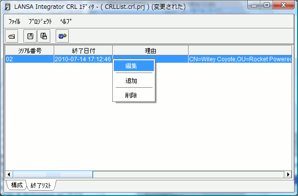 9. [編集]ポップアップ・メニュー・アイテムを使用して、[終了日付] と [理由] を変更することができます。                                                                          [シリアル番号]、[終了日付]、[理由] は、CRL ファイルに保管されている値のみになります。