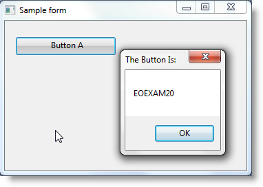 フォームをコンパイルし、実行します。キャプションがButton Aのボタンが表示されます。クリックすると、ボタンの再利用可能パーツの名前を表示するメッセージ・ボックスが表示されます。
