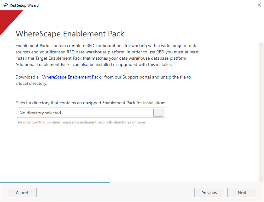 1. The WhereScape Enablement Pack window displays. As the dialog explains, you can download the Enablement Pack from the Support portal and unzip the file to a local directory, click to select the directory that contains the unzipped Enablement Pack, once your configuration is complete, click Next to continue.
