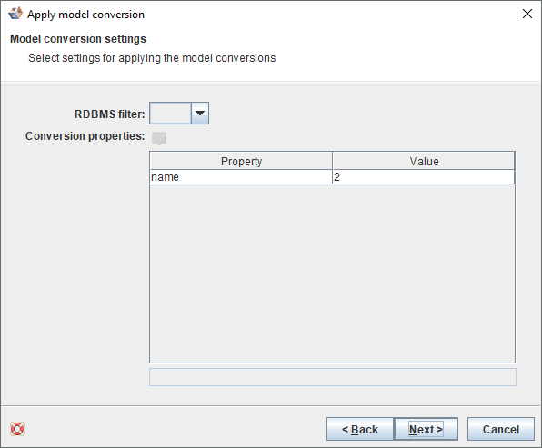 This dialog is only displayed if the model conversion has any rules with RDBMS filters set or Conversion properties.