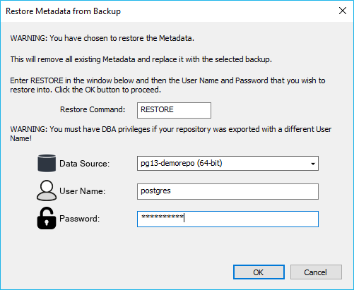 To restore the metadata from a backup, use the menu item Backup > Restore the Metadata (PostgreSQL pg_restore)