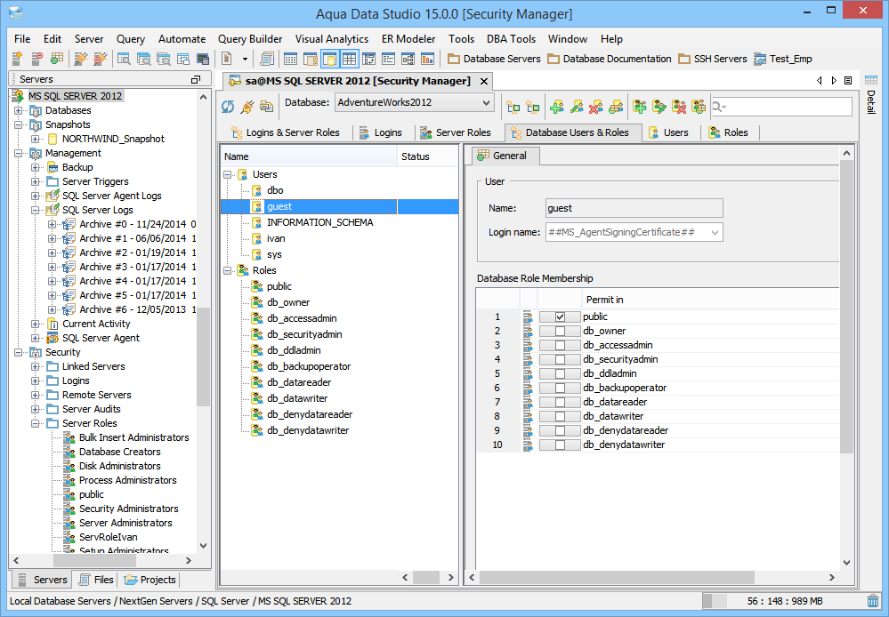 | Database Users & Roles Tab - Provides a tree display of users and roles (groups) in the MS SQL database. Selecting an object in the tree structure displays a detailed view of the object on the right side pane. | |