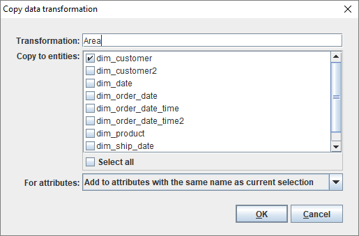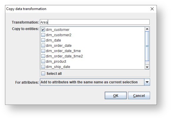 - The Copy data transformation dialog is displayed, enabling you to copy a transformation to selected entities and attributes: