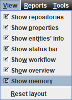 To show the memory usage indicator select Show memory from the View menu, as shown in the following screenshot: