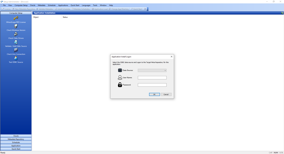 • Select the ODBC Connect for the repository from the drop-down list, enter the Username and Password, and click OK. The model is imported and Setup Administrator is closed upon completion.