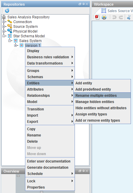Right-click on the version of the model in the left pane and select Entities>Rename multiple entities. Alternatively, right-click on a white space in the diagram and select Tables>Rename tables or click on in the toolbar and select Rename multiple tables from the list.