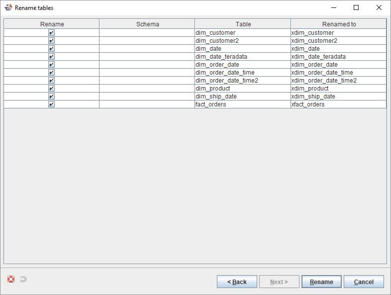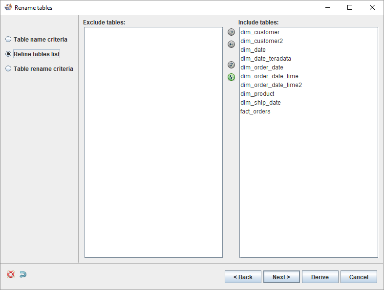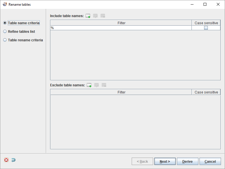 - Click to specify which tables are to be included or click to specify which tables are to be excluded in this renaming process. Click Next.