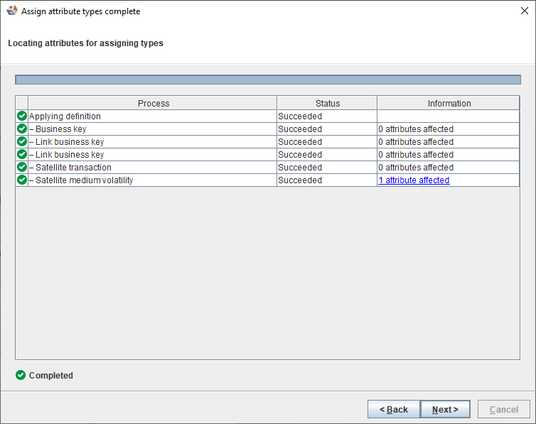 The Assign attribute types complete dialog is displayed. - The status of the individual processes are indicated as they are processed.