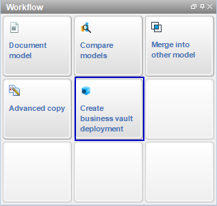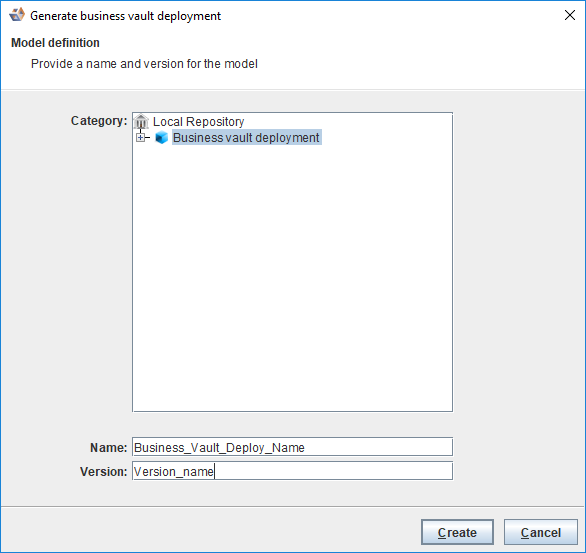 Click the Create business vault deployment button, the Generate business vault deployment wizard opens, type the Name and the Version, and click Create.