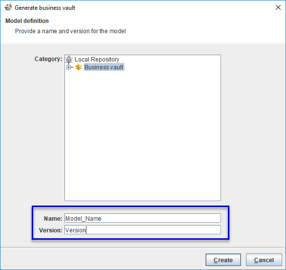 - When the Business vault model window opens, type a Name and Version for the model, and click Create.