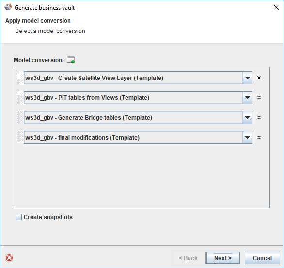 - When you select a model under the Data vault category, the Generate business vault workflow button displays.