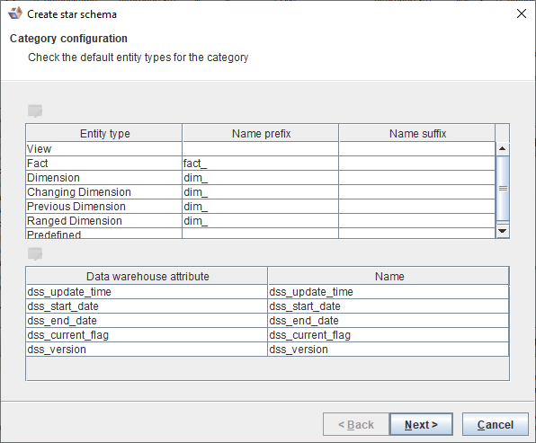 The Create star schema-Category configuration dialog is displayed. - If needed complete the following: