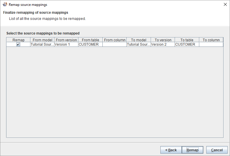 - From the Finalize remapping of source mappings dialog, finalize the list of source mappings to be remapped and click Remap.