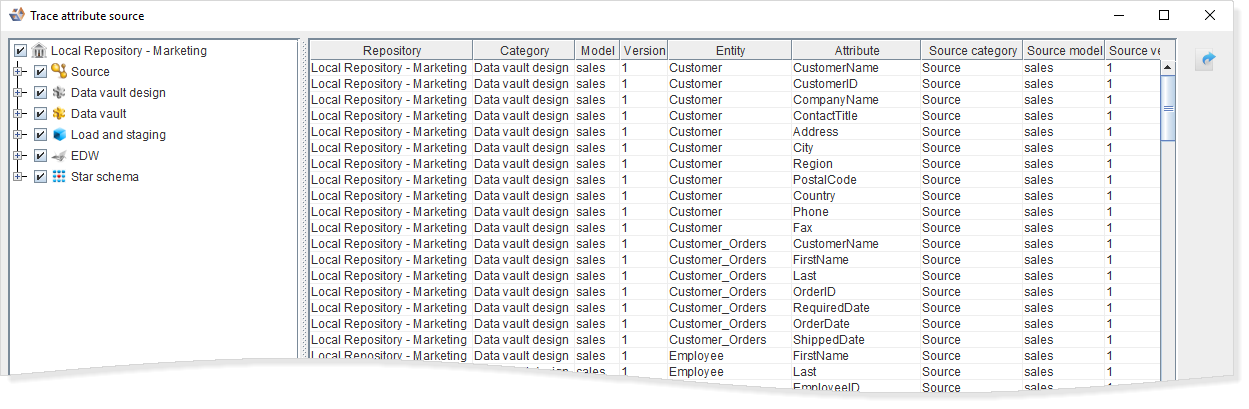 This report traces the source for all attributes in the selected models.