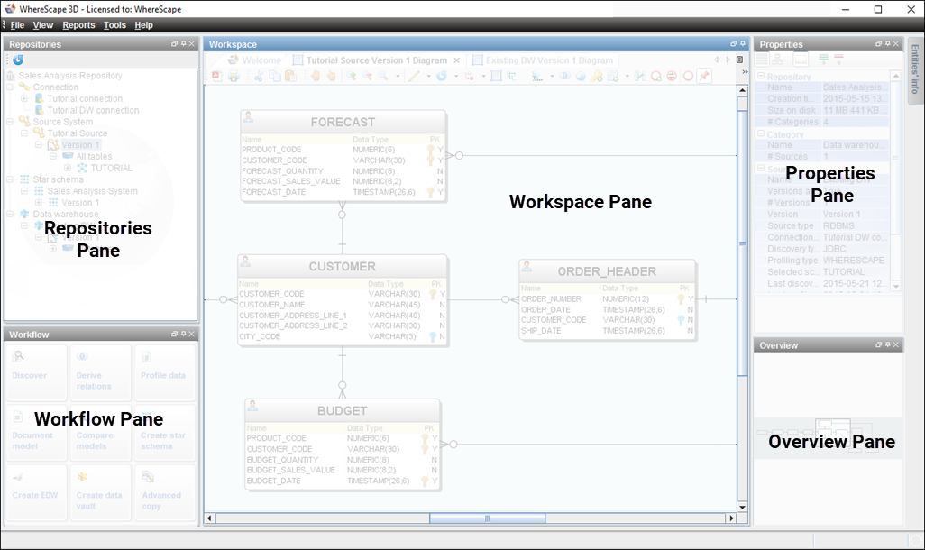 The main window typically has five active panes. All of these panes can be dragged out of their docking positions and placed elsewhere.