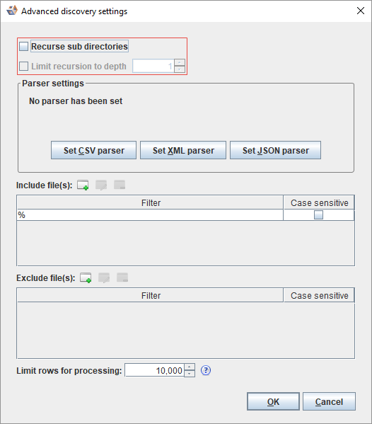 2. Choose whether the file discovery process should include files in sub directories and optionally how deep through the directory tree to traverse.