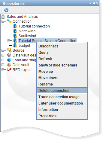 To delete a connection:Right-click on a connection and select Delete connection.Select Yes on the confirmation dialog.The connection is deleted.