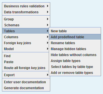 - Right-click on the version of the model in the left pane and choose Entities, then Add predefined entity. Alternatively, right-click on an empty space within the diagram and choose Tables, then Add predefined table.