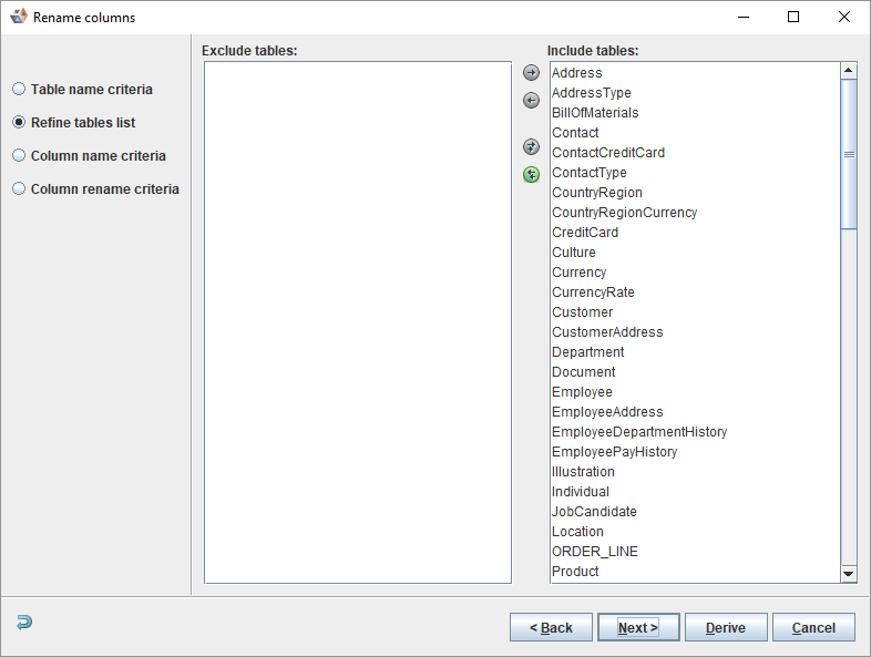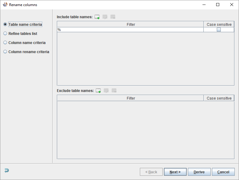 - The table name criteria and refine tables list panes of the wizard are identical to the first two panes of the rename multiple tables wizard and allow selecting the tables to be included.