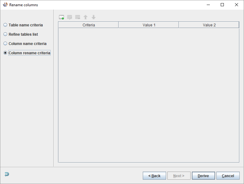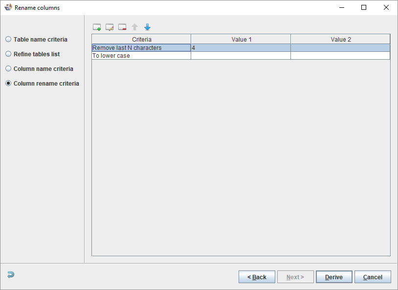 - After adding some criteria, clicking Derive determines which columns will be renamed and what their new name will be.
