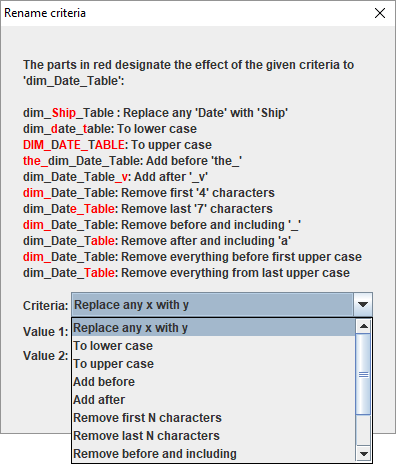 - The Rename columns - Column name criteria dialog enables you to include or exclude column names based on their name in the same way as the 'Entity name criteria' pane.