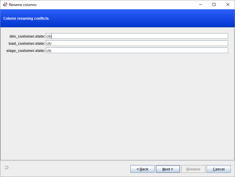 - Finally, the columns that will be renamed are shown with what they will be renamed to. If you don't want some of these columns to be renamed, deselect the corresponding check-box in the Rename column. Clicking Rename applies the selected renames.