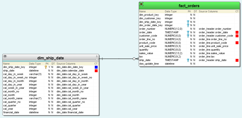 - The purple line indicates that an artificial key has been created and the artificial key is displayed in the destination table.