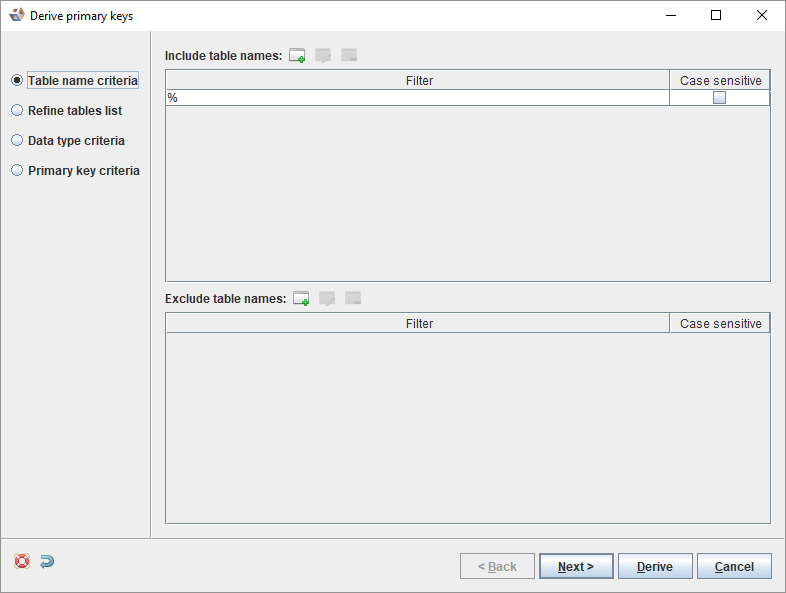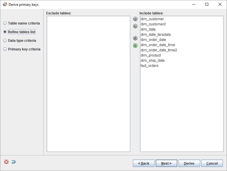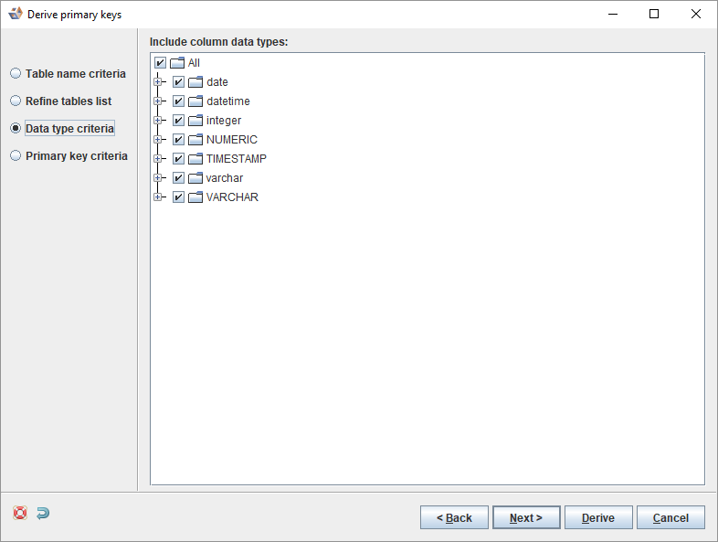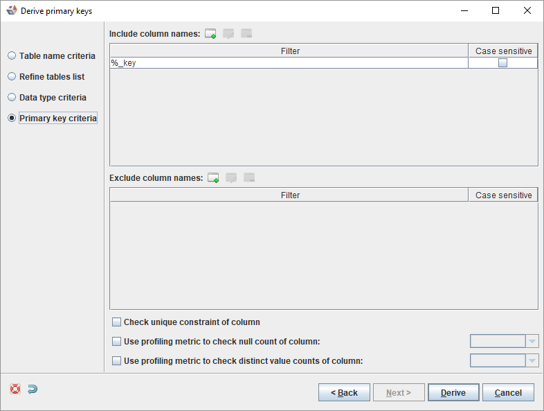 - The next dialog displays action options for detected primary keys. Set options as required and click Derive.