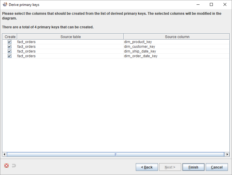 - All primary keys to be added are now listed. Turn off any keys you do not want to include and click Finish.
