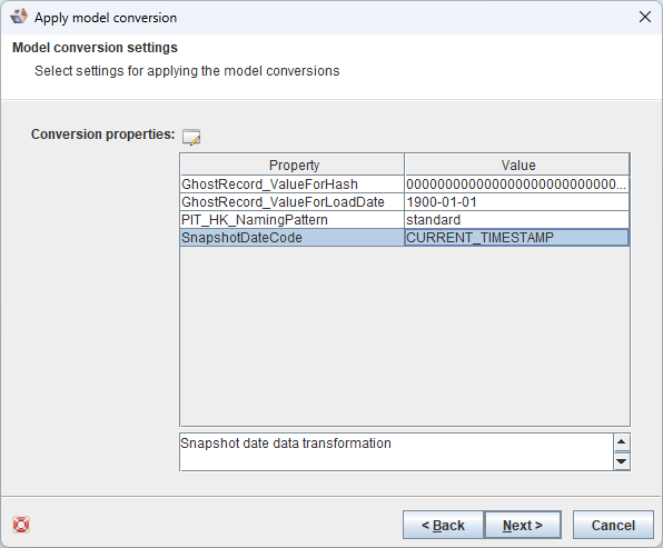 Conversion properties are used to store information which can be referenced in individual model conversion rules. Their values can be defined by the user prior to executing a conversion set or by using Pebble templates.