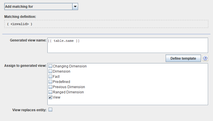 Creates a view for each matched entity, and either creates source mappings from the view to the entity or replaces the entity with the view.