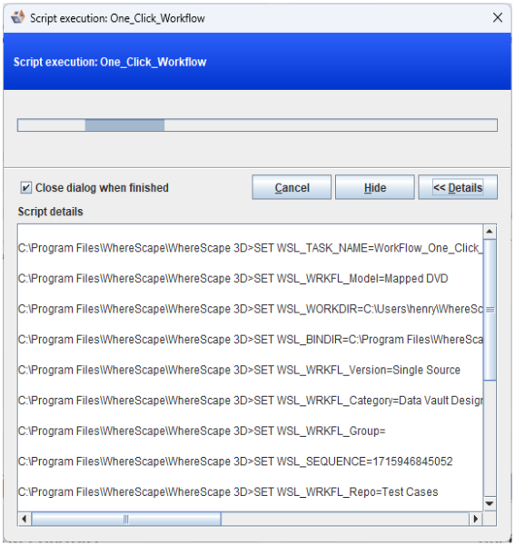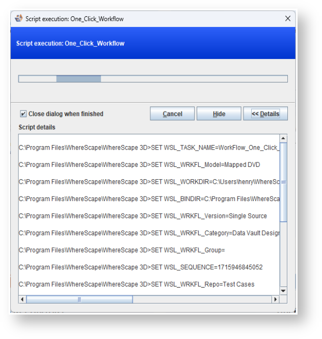 WhereScape 3D shows a progress dialog when executing scripts. Click the‘Details’ button to expand the progress dialogue and display all output from the script being executed. This gives a convenient place for users to view any success or error messages returned by the script.