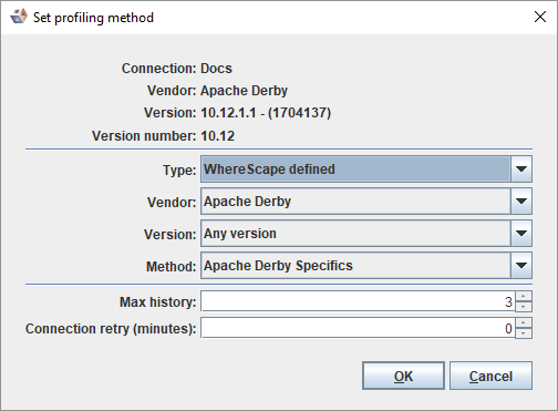 - Change the profiling type using the Type drop down. Confirm the Vendor, Version and Method; click OK.
