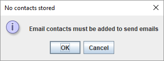 - If there are no contacts, the No contacts stored dialog is displayed. Click OK to add contacts.