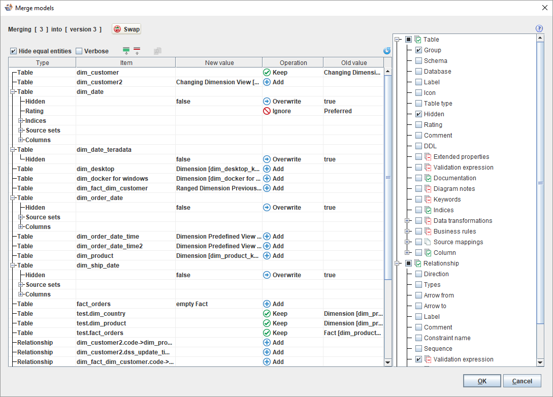 - If the object or property exists in the model being merged into but not in the model being merged the options available are Keep, Delete, and Ignore.