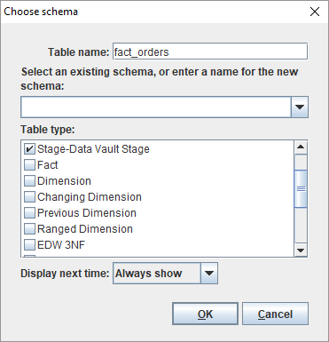 - For each table selected, you will be prompted to choose a table type and to change the table name if necessary.