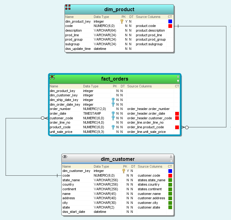 - The Customer table will now be displayed in the diagram as a changing dimension. The foreign key join is also displayed, showing how the dim_customer table is related to the fact_orders table.