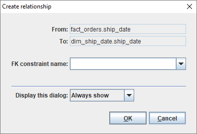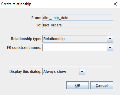 When creating a relationship in a logical model, some additional options are available on the Create relationship dialog box.
