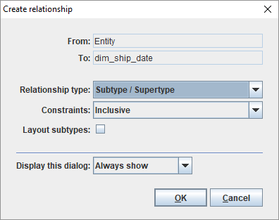 - Layout subtypes - ticking this checkbox enables the diagram to be refreshed immediately, displaying the new subtype / supertype relationship.