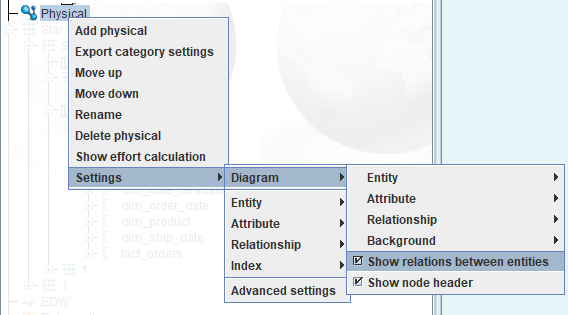 - To have these multiple relationships displayed in the diagram as a single link (as below), right click on the category in the tree and select Settings > Diagram > Show relations between entities.
