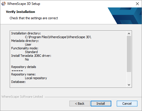 7. Click Install. The installation may take several minutes. Once the installation is complete, the Completing the WhereScape 3D Setup Wizard screen is displayed, as shown in the following screenshot: