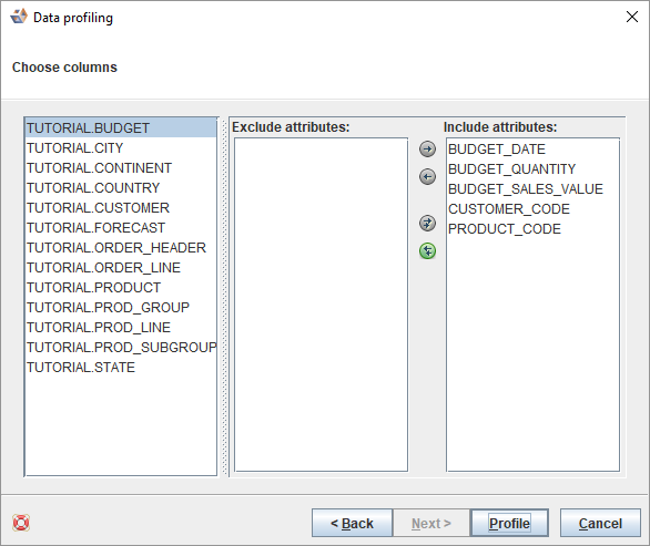 - Edit the table list. This step is skipped when profiling a single table or column. Click Next if you want to edit the column filters, else click Profile to skip the steps that follow and begin profiling.