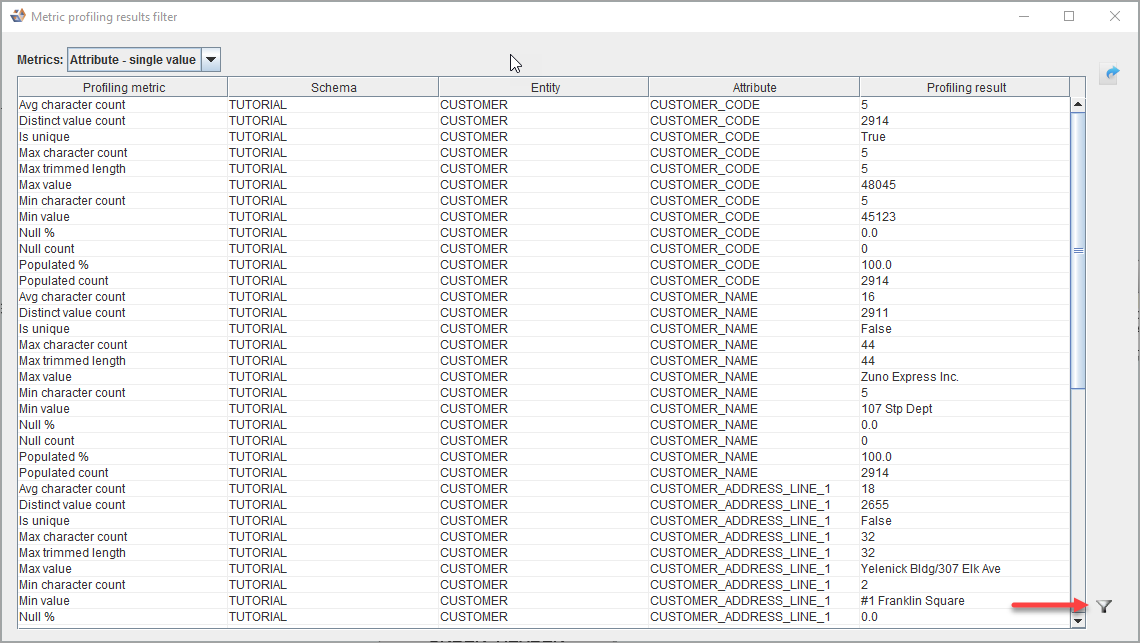 To view the Metric result table from the diagram, right-click on an entity in the diagram and choose Profiling result, then Show data profiling result in table.