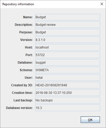 To view the repository information:Right-click on the repository and choose Information.The following information is displayed: