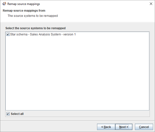 - From the Remap source mappings from dialog, select the source systems to be remapped. Click Next to continue.