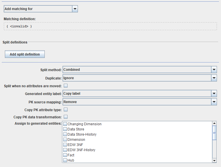 Select for the criteria for finding the matching entity to use for splitting the matched entity. Click the Add split definition button to add other criteria that will be applied to same entity.