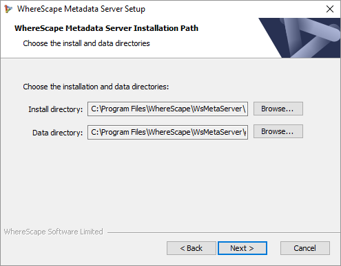 • Confirm the Install directory and Data directory for the WhereScape Metadata Server.