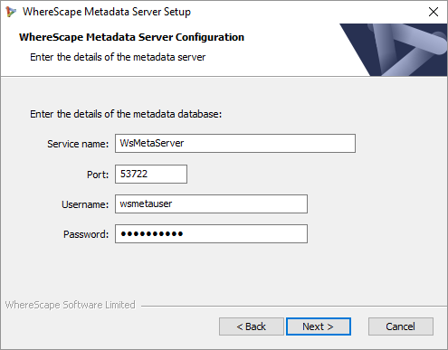 • Click Next. The WhereScape Metadata Server Configuration screen is displayed, as shown in the following screenshot:
