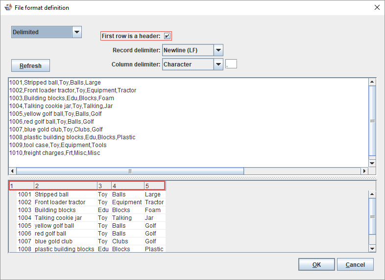• If the first line of the file contains the column names, checking First row is a header will use them and assume that the column data starts on the second line.